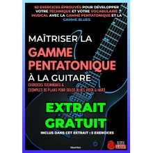 Cet extrait gratuit du pack pédagogique "Maîtriser la Gamme Pentatonique" vous donne un aperçu de la méthode avec certains chapitres et 5 exercices sélectionnés parmi les 62 de la version complète.
